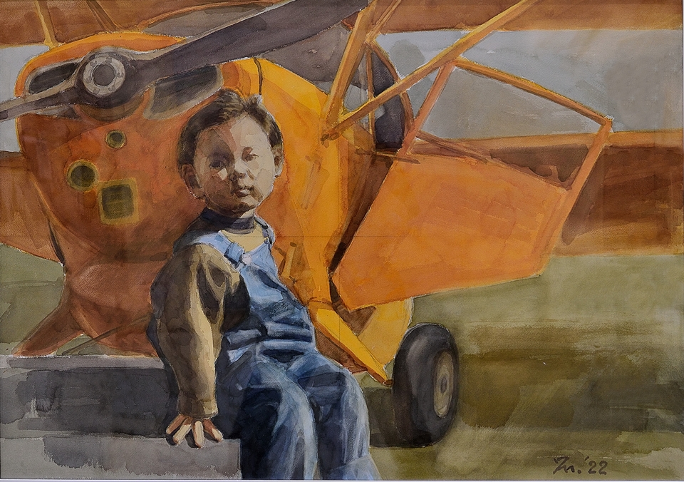 オレンジ色の飛行機の前で |