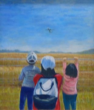 飛行機を見る親子 |